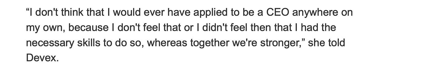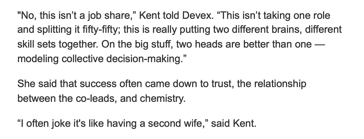 This is the way that many other organisations in the development space and outside it are working. Two bosses effectively, but it’s more than a job share as Alex Kent, co-CEO of Restless Development told me for this piece that I wrote for Devex last week. You can read it here.